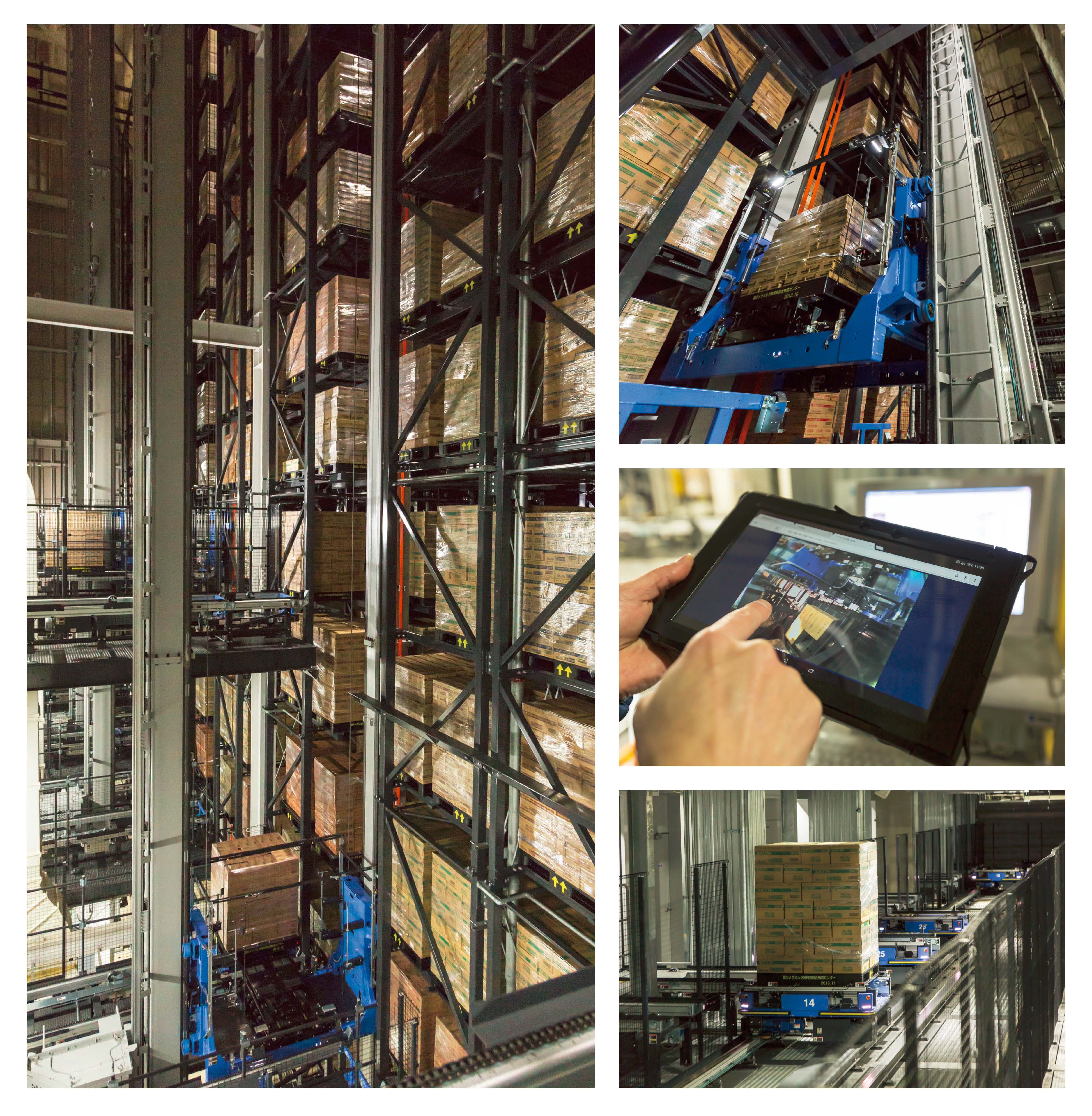 (1)日本最大規模的低溫自動倉庫系統。 (2)堆垛機配備雙叉雙深貨叉,是高密度高處理能力的自動倉庫。 (3)配備了一臺堆垛機的攝像機。通過視頻,使設備的狀態和狀態實時可視。 (4)高速有軌式搬送臺車RTN-X,作為自動倉庫的出入庫系統。 |