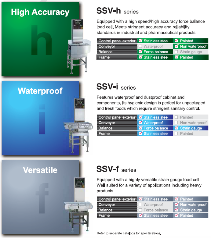 1. Accurate EWith accuracy as low as ±0.01g, quoted at 3σ at speeds up to 600 products/min, the SSV delivers top performance and productivity. 2. Reliable With eight generations and 90,000 installations worldwide since 1964, Anritsu checkweighers are engineered for decades of dependable use. 3. Fully Featured Anritsu checkweighers include easy-to-use touch screens, USB, Ethernet, programmable I/O, full statistics, and autolearn wizard. 4. Compact Footprint Checkweighers start at just 545mm (21.5 inches) long, perfect for lines that are tight on space. |