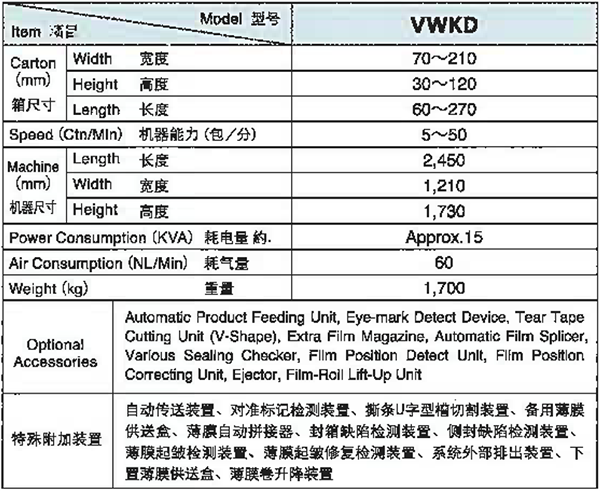 A film-over wrapping machine which pushes cartons to film supplied from a rolled film, sever the film, and wrap the cartons over with the film after accumulating certain number of cartons.