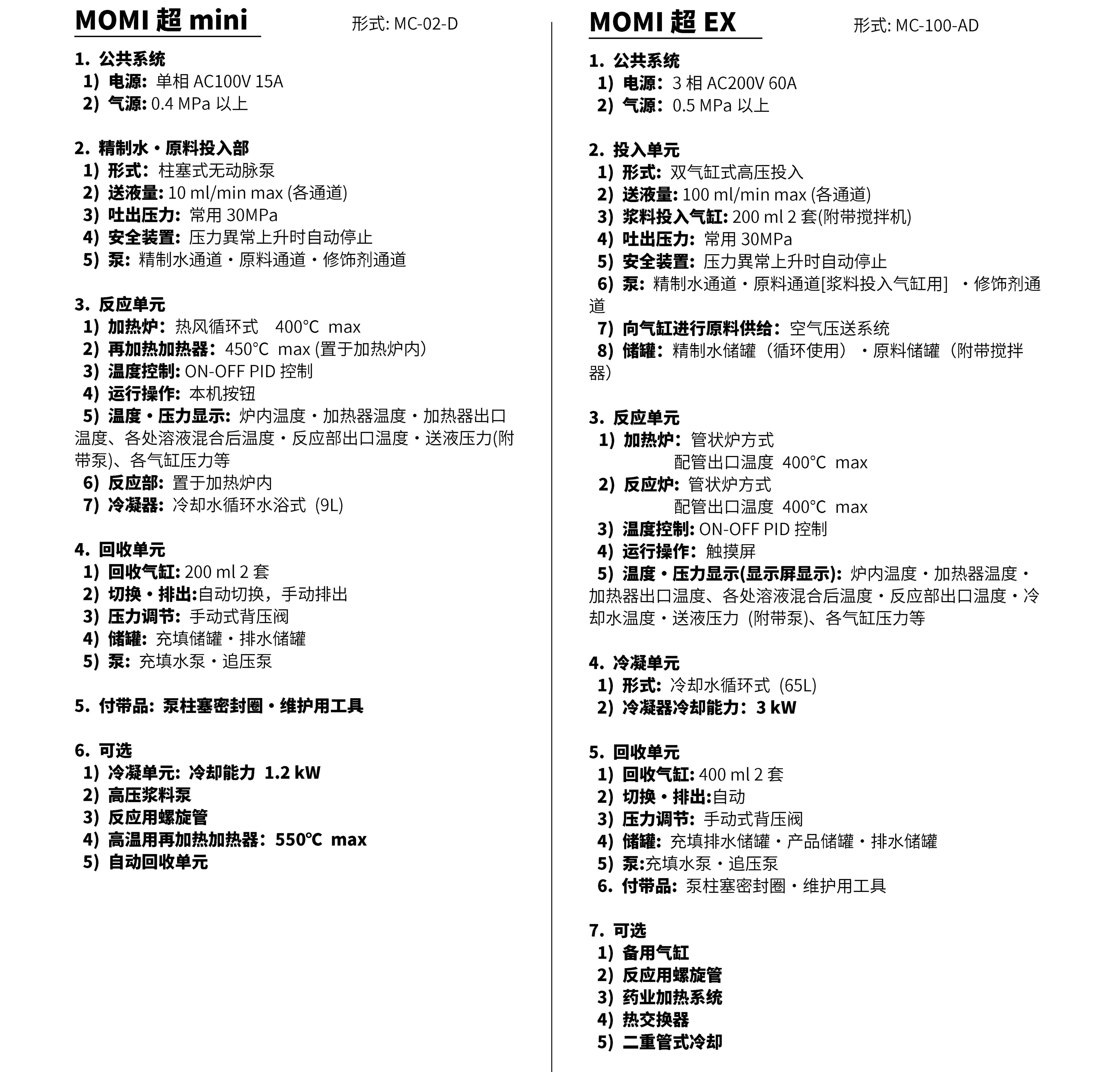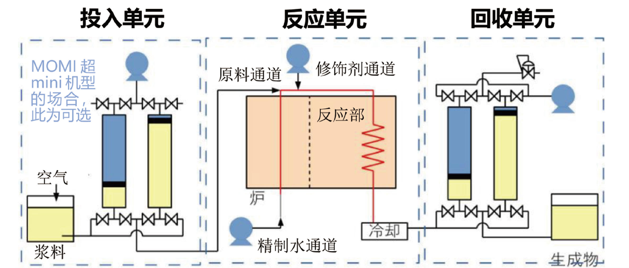 通過流通方式進行超臨界水處理的裝置。 超臨界水指的是:在溫度374°c,壓力22.lMPa以上狀態(tài)的水兼具液體和 氣體特質的狀態(tài)。本裝置為流通式,連續(xù)進行原料處理,比起批量式節(jié)約時間。粒子送液·回收通過氣缸系統(tǒng)。